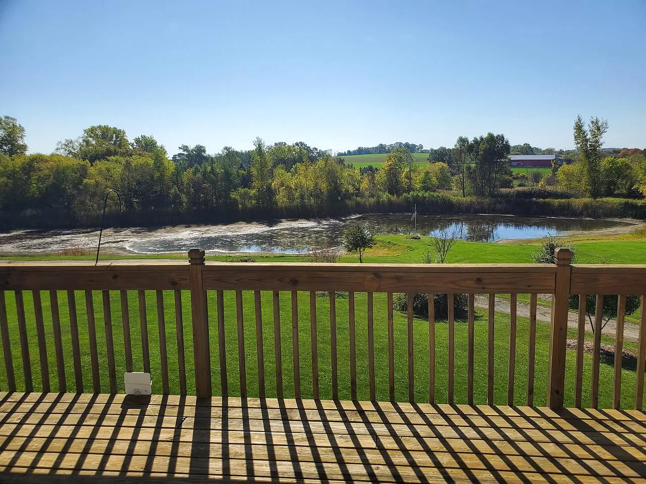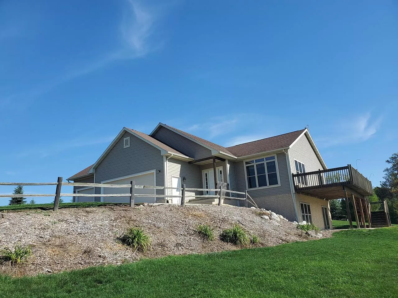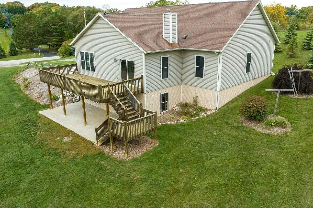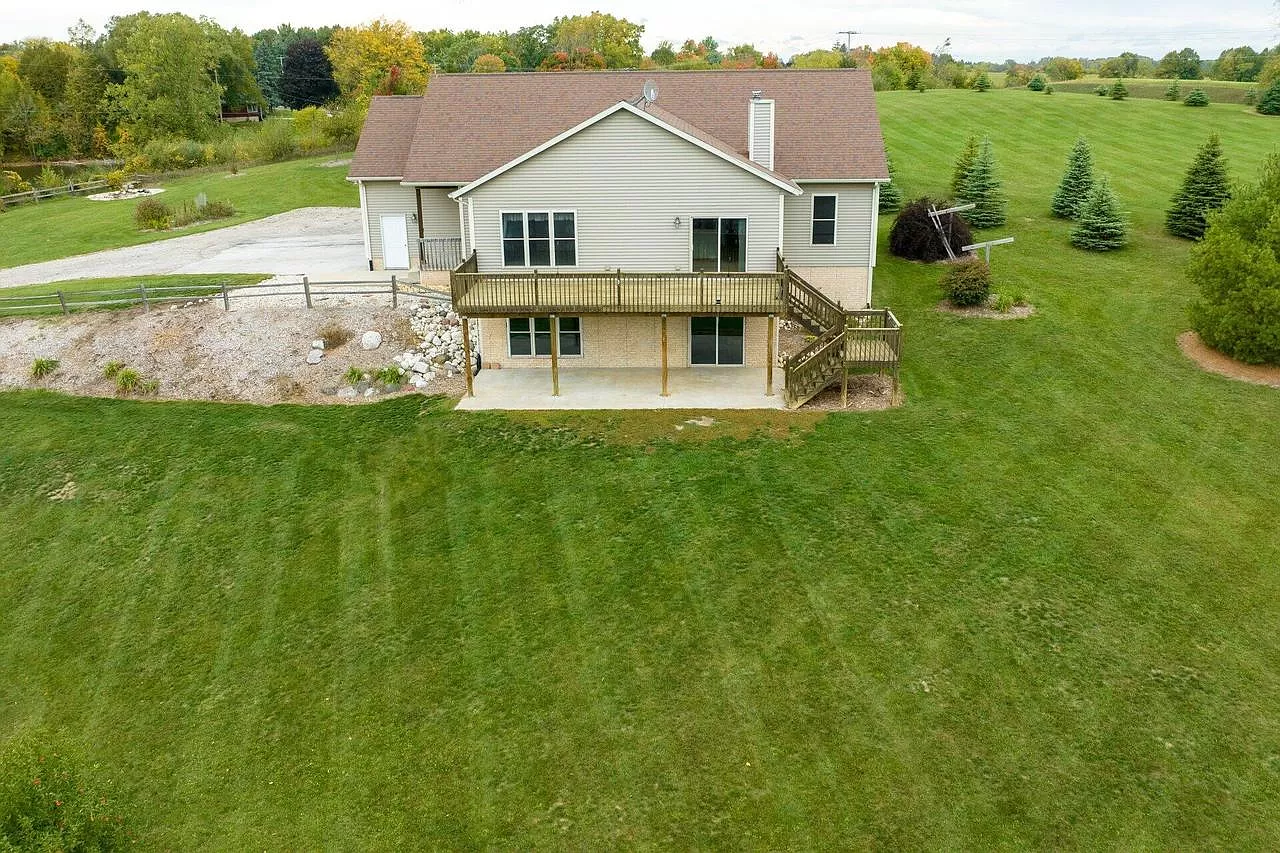 Original owner is selling this mini-estate retreat. This is an absolute must see property. This home sits on 5 acres with an almost 2 acre pond, a huge quality built 40 x 56 heated workshop/pole barn w/12 foot ceilings. Scenic, breathtaking views from the whole property. Open concept inside the home with 9 foot ceilings. Huge, attached 3 car garage with access to the walk-out lower level. Lots of closet space inside the home. Lower level is plumbed and electrical is done, all you have to do is drywall and add another bathroom. Large deck and patio area overlook the beautiful yard and pond. Enjoy the deep fire pit looking at your neighbors pond across the street. Property is located on a dead end street, so much privacy. Perfect layout and setting. Enjoy the wildlife from your new home!!!